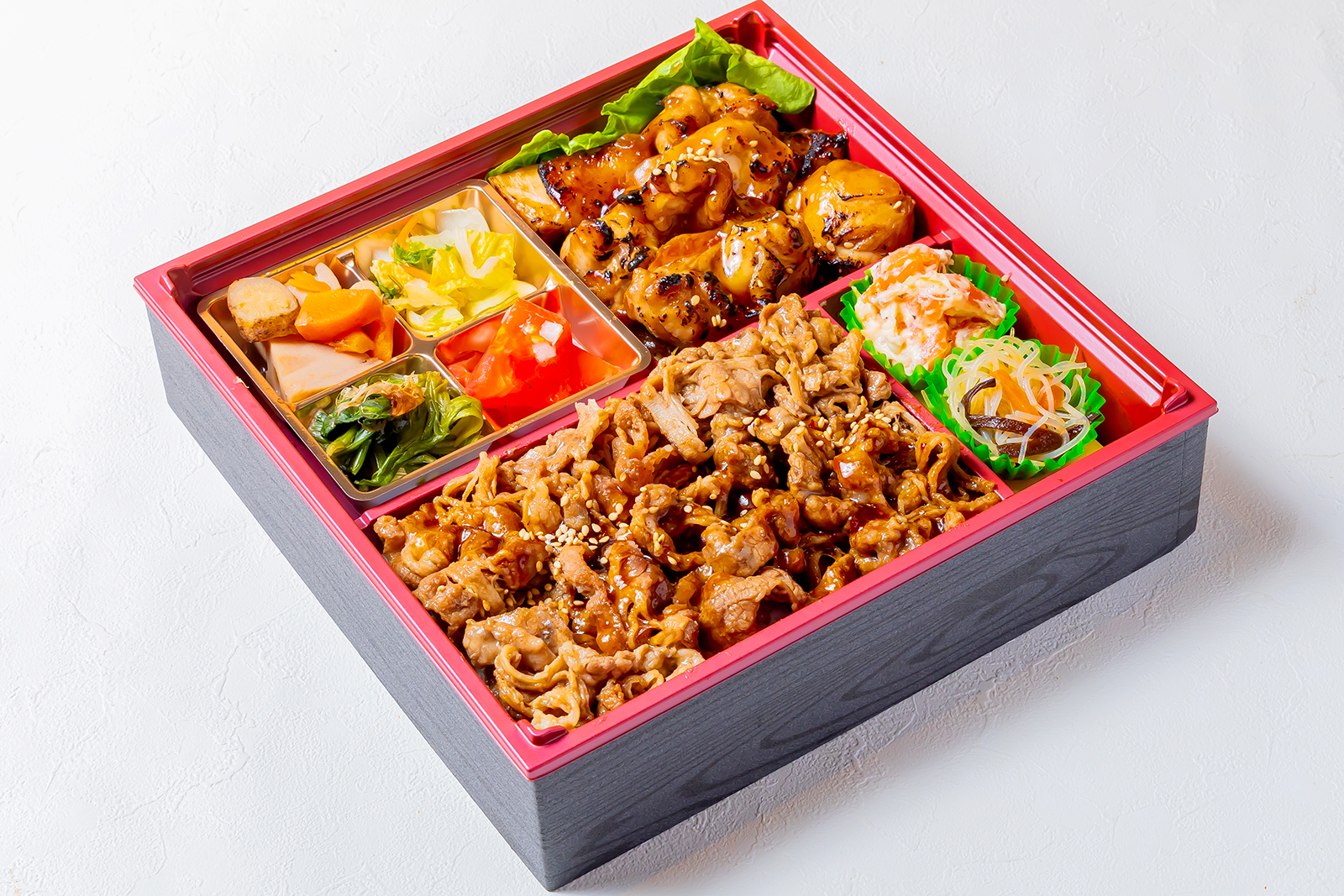 内 容焼肉重、グリルチキン、季節の副菜6種